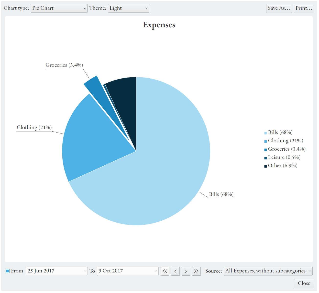- Cartes à gâteau, diagrammes à barres et tableaux pour la comparaison des dépenses ou des revenus entre différentes catégories, descriptions ou rémunérations/payeurs